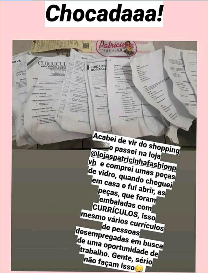 Porto Velho, RO – Nesta quinta-feira (27), um assunto tomou conta das redes sociais: uma loja de bijouterias e outros acessórios embalou os produtos de uma cliente com folhas de currículo deixados na empresa por desempregados. A loja emitiu nota lamentando o ocorrido.