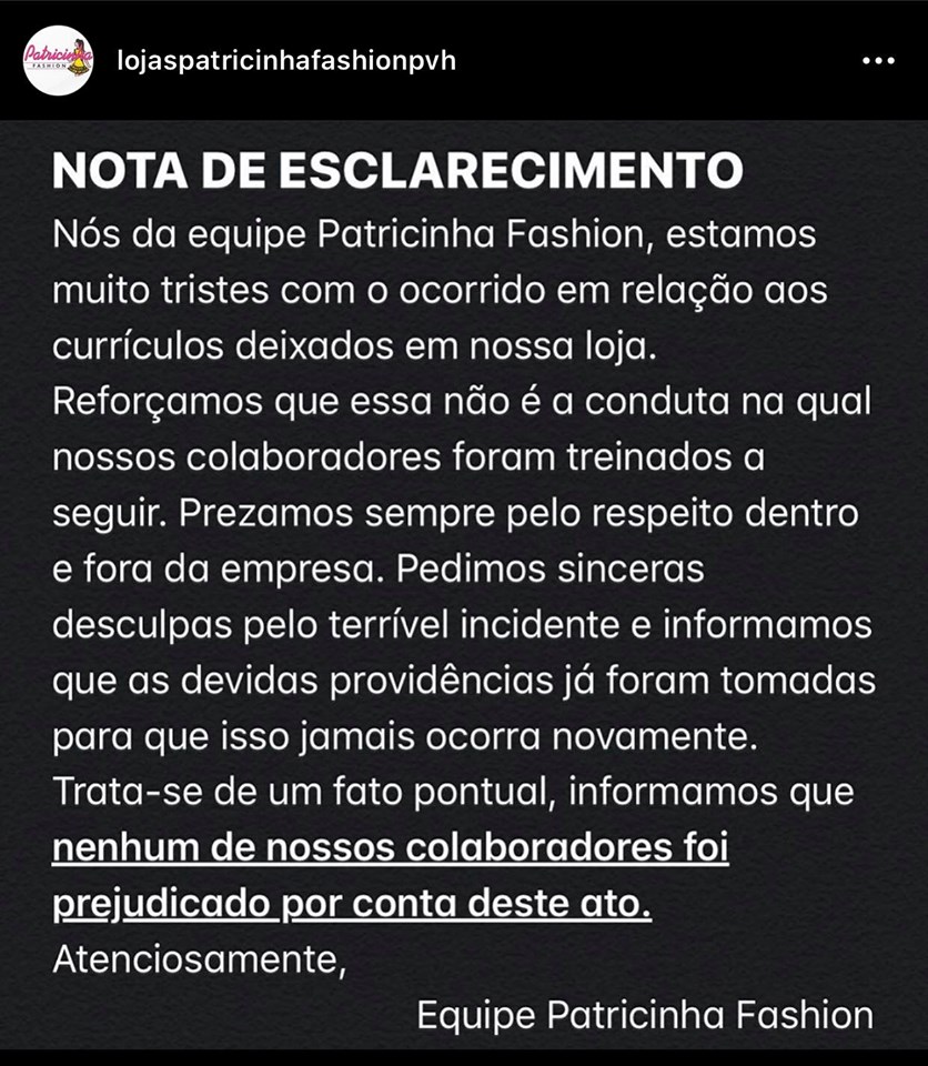 Em seu perfil no Instagram, a loja afirmou estar triste com ocorrido e que esta não é uma conduta para qual os funcionários foram treinados, prezando sempre pelo respeito dentro e fora da empresa. Finalizando, se desculpa pelo que qualificou como “terrível incidente”, afirmando que já foram tomadas as devidas providências para que isto não ocorra novamente.