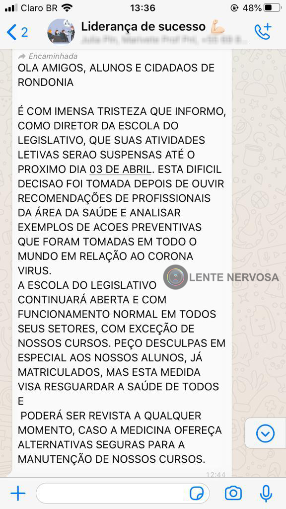 O comunicado da suspensão temporária dos cursos na Escola do Legislativo foi enviado em um grupo de WhatsApp por uma professora, e afirma que a decisão foi tomada após recomendações de profissionais da saúde.