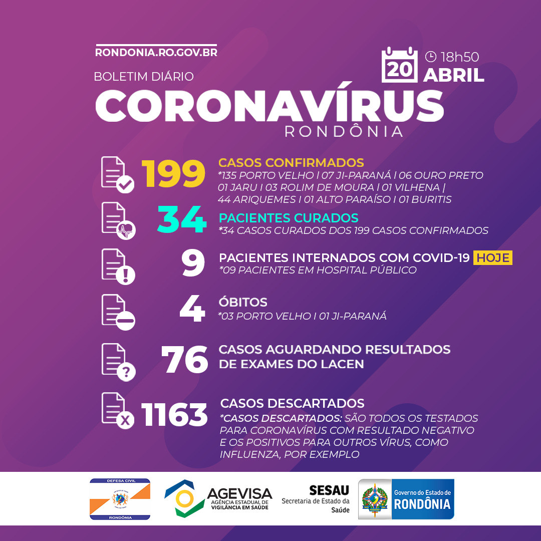 “Os 199 casos confirmados para Covid-19 são nas seguintes localidades: 135 em Porto Velho; 44 em Ariquemes; sete em Ji-Paraná, seis em Ouro Preto do Oeste; três em Rolim de Moura; um em Alto Paraíso, um em Buritis; um em Jaru e um em Vilhena.