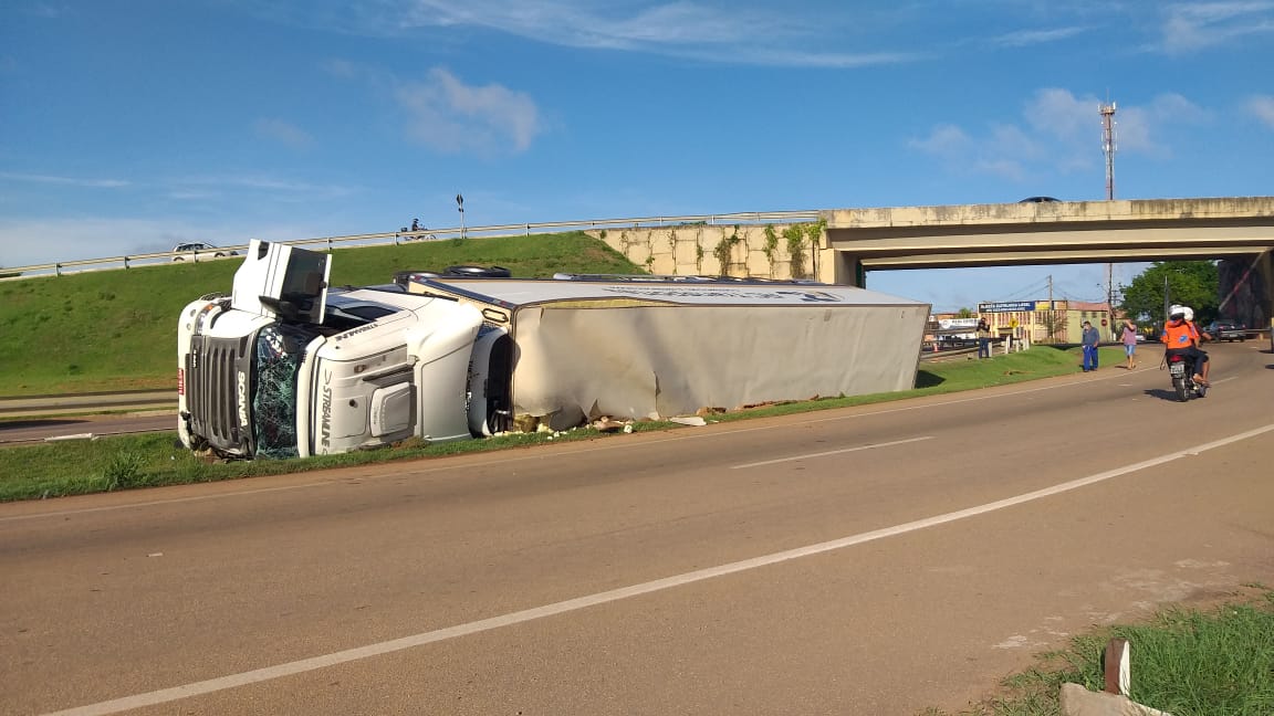 Porto Velho, RO – O motorista de um caminhão baú tombou o veículo na madrugada desta quarta-feira (13) em uma curva logo após passar por baixo do viatudo no antigo Trevo do Roque. Apesar da gravidade do acidente o motorista sofreu leves escoriações.
