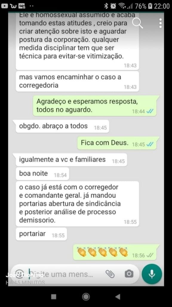 “O caso já está com o corregedor e o Comandante Geral já mandou portaria abertura de sindicância e posterior processo demissório’. Como resposta, obteve os emojis de aplausos.