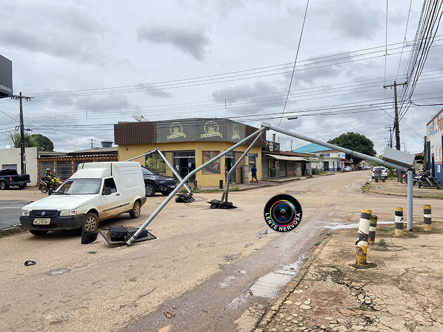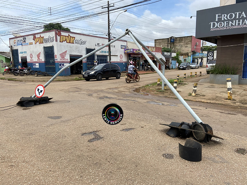 Porto Velho, RO – Toda a estrutura dos semáforos localizados no cruzamento da Rua Algodoeiro com Rua Geraldo Siqueira, Bairro Conceição, zona sul da capital, foram ao chão na manhã desta quarta-feira (06). Um veículo arrastou a fiação e derrubou os postes.