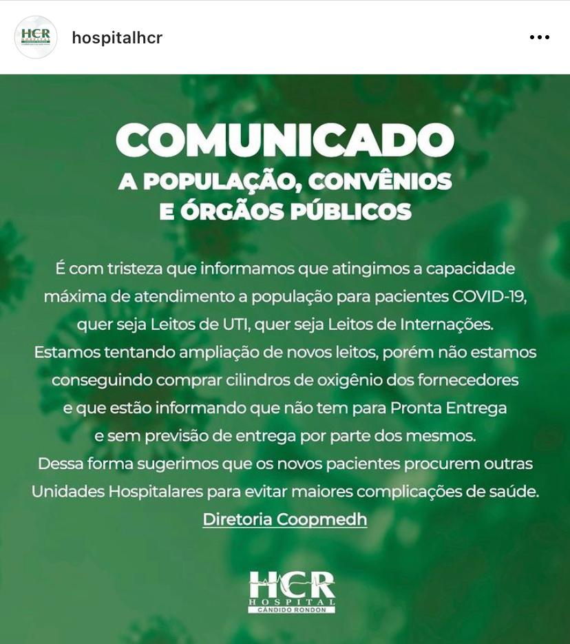 A nota afirma ainda que o hospital está tentando ampliar novos leitos, porém, não está sendo possível a compra de cilindros de oxigênio, pois os fornecedores afirmam que não tem o produto a pronta entrega, nem previsão de quando poderão entregar os cilindros com oxigênio.