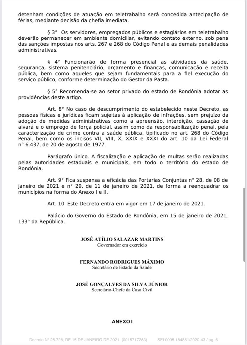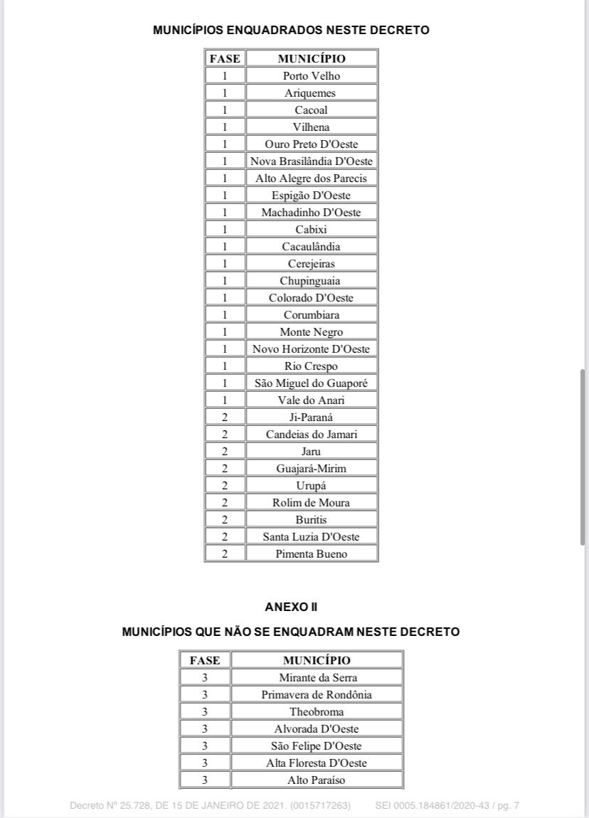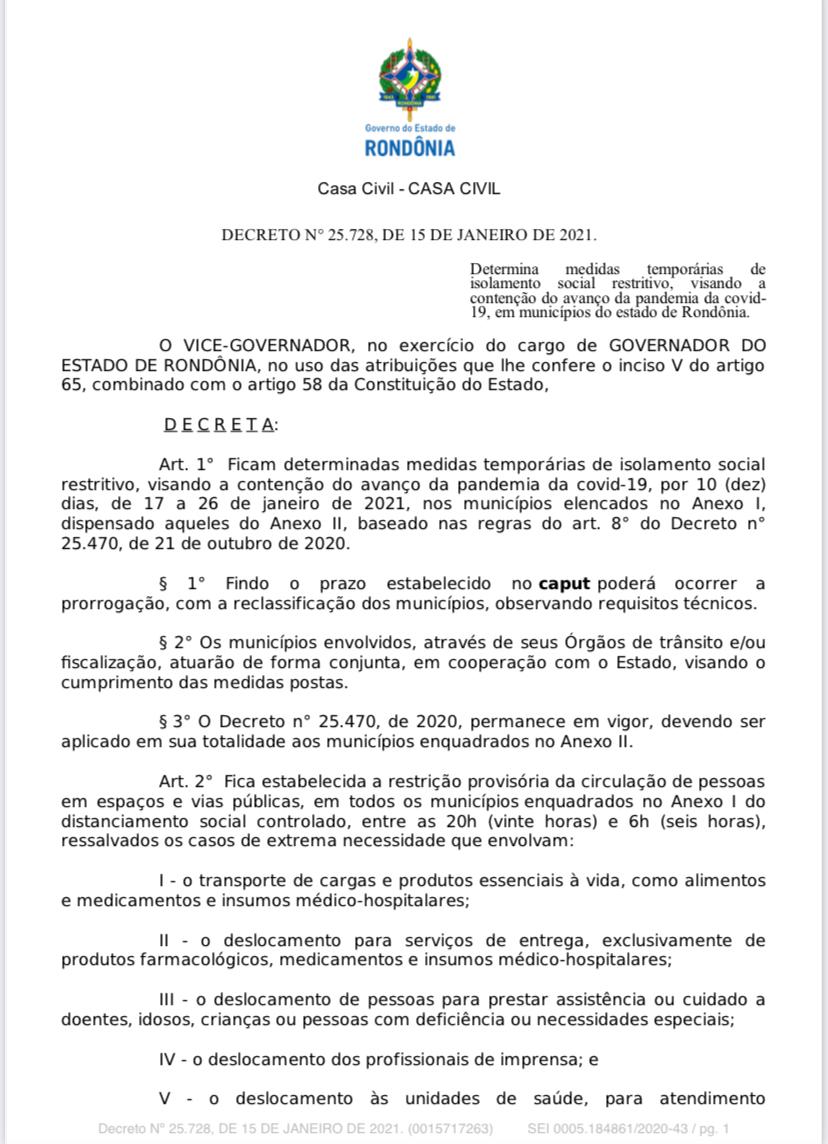 Porto Velho, RO – O Governo do Estado de Rondônia emitiu, na noite desta sexta-feira (15), o Decreto nº 25.728 de 15 de janeiro de 2021 que determina medidas temporárias de isolamento social restritivo, visando a contenção do avanço da pandemia da covid-19, em municípios do Estado de Rondônia.