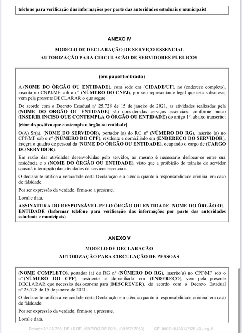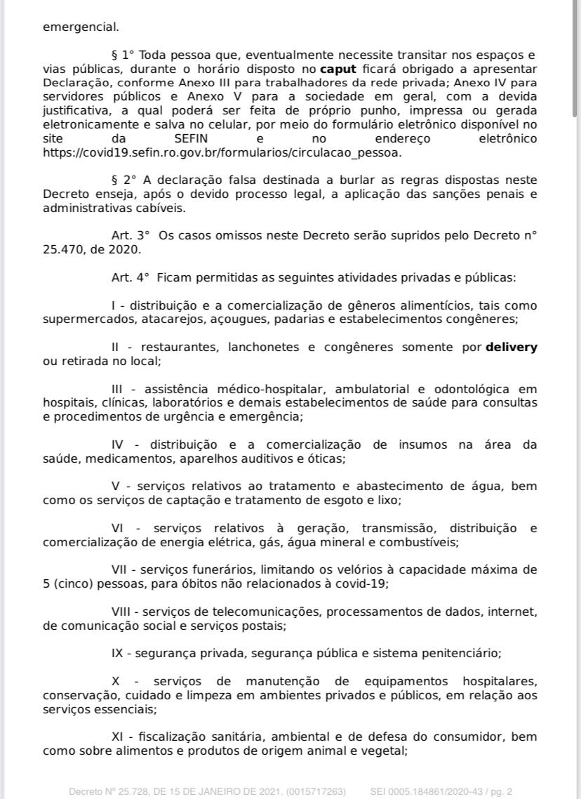O decreto salienta ainda que toda pessoa que necessite transitar nos espaços e vias públicas entre às 20h e 6h ficará obrigado a apresentar declaração feita a próprio punho, impressa, ou gerada eletronicamente e salva no celular através do site da Secretaria de Finanças (Sefin), através do link: http://covid10.sefin.ro.gov.bt/formularios/circulacao_pessoa. Caso o cidadão faça uma declaração falsa, visando burlar as regras do decreto, poderá sofrer sanções penais e administrativas.