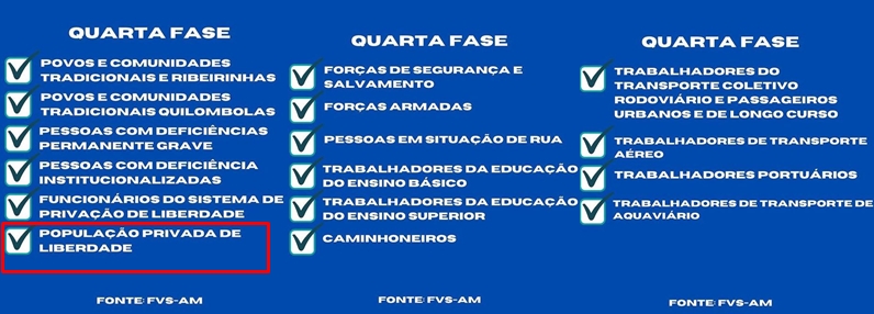Conforme as diretrizes da FVS-AM, os grupos prioritários na quarta-fase são: Comunidades ribeirinhas, povos e comunidades tradicionais (quilombos), Pessoas com Deficiência Permanente Grave, pessoas com Deficiência Institucionalizadas, Funcionário do sistema de privação de liberdade, população privada de liberdade, Forças de segurança e Salvamento, Forças Armadas.