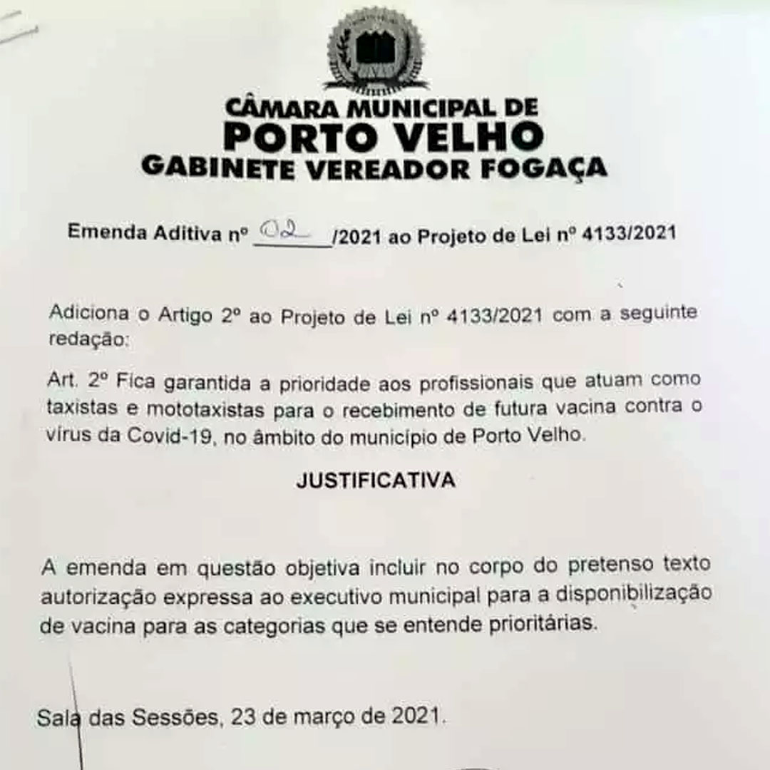 Com Emenda Aditiva nº 02/2021, ao Projeto de Lei nº 4133/2021, o vereador Everaldo Fogaça (Republicanos), garantiu que estes profissionais possam receber a futura vacina contra o vírus da Covid-19, no âmbito do município de Porto Velho.