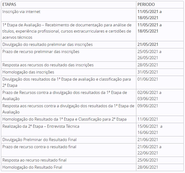 A seleção será constituída de duas etapas, sendo obrigatória a participação dos candidatos que tiveram suas inscrições homologadas. Em caso de não comparecimento do candidato em qualquer uma das fases, o mesmo será desclassificado. A data e horários das entrevistas técnicas serão comunicadas ao candidato por meio de edital, que será disponibilizado no mesmo link da inscrição.
