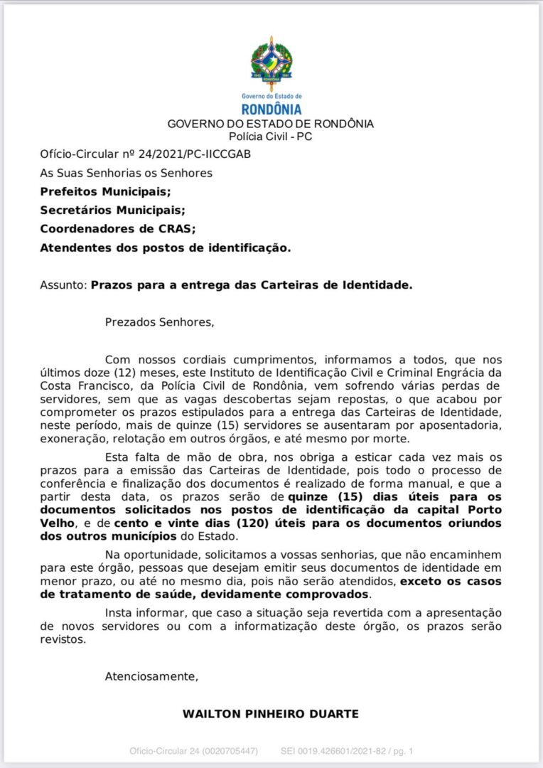 O documento foi assinado, eletronicamente, no dia 16 de setembro de 2021, e informa que os prazos para entregas das identidades serão de 15 dias úteis para os documentos solicitados nos postos de identificação da capital e 120 dias para documentos oriundos de outros estados.