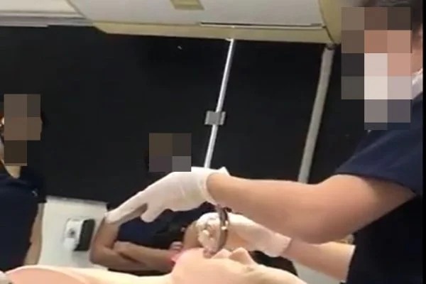 As imagens registram a frase sendo dita após o docente, que ensinava somente mulheres a fazer um processo de intubação em paciente, usando um boneco, questionar se a estudante havia lubrificado o tubo. Ela admite que não.