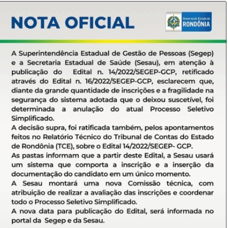 De acordo com a Sugep, diante da grande quantidade de inscrição e a fragilidade na segurança no sistema adotada que deixou suscetível, foi determinada a anulação atual do processo seletivo simplificado. A decisão foi ratificada também pelos apontamentos feitos no Relatório Técnico do Tribunal de Contas (TCE), sobre o edital 14/2022/SUGEP-GCP.