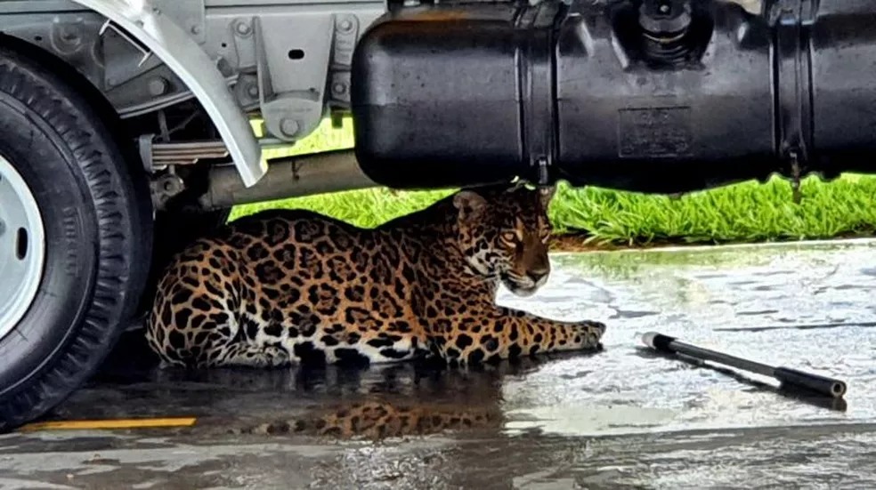 Uma onça-pintada invadiu a base de abastecimento do Aeroporto Brigadeiro Camarão na manhã do sábado (9) e ficou deitada embaixo de um caminhão estacionado. Quem percebeu a presença do felino foi um funcionário do aeroporto.