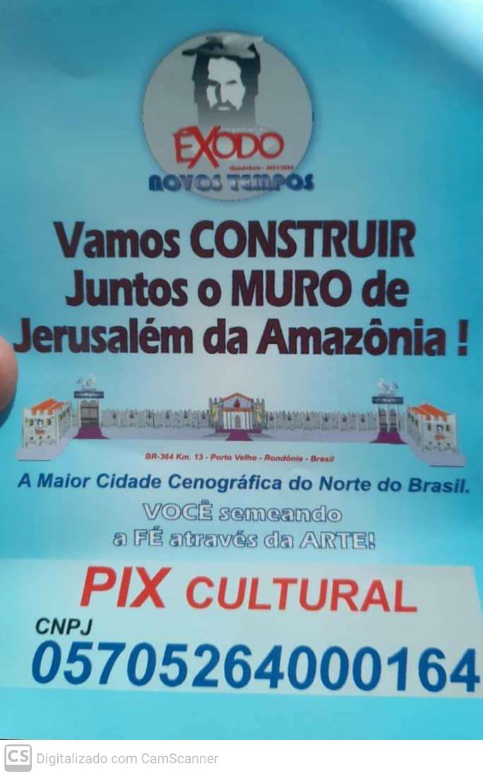 O Grupo Êxodo, responsável pela peça teatral “O Homem de Nazaré”, agora com nova diretoria, lançou esta semana o Projeto PIX Cultural, onde pretende arrecadar fundos para reconstruir o muro da cidade cenográfica Jerusalém da Amazônia, localizada a 21 quilômetros da cidade de Porto Velho (KM 13 da BR-364), próximo a Candeias do Jamari.