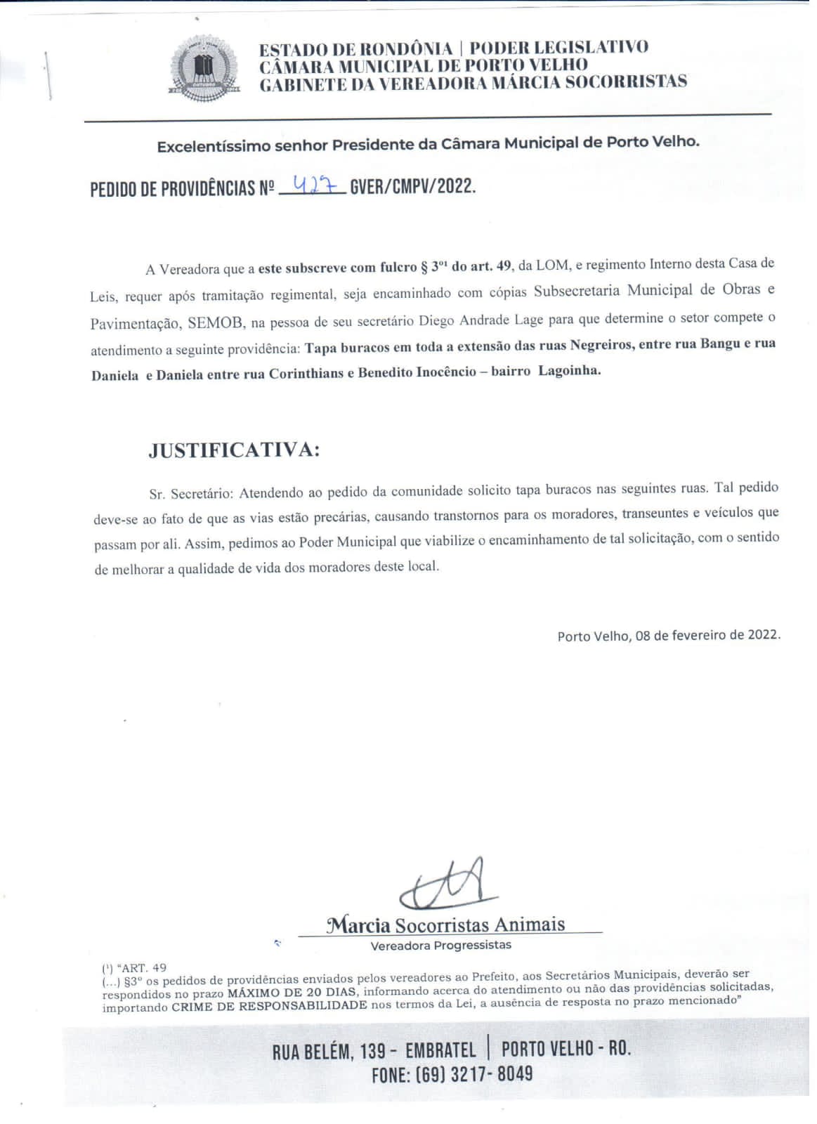 Através do Pedido de Providência nº 427, a vereadora Márcia Socorristas Animais (PP), solicitou à Secretaria Municipal de Obras e Pavimentação (Semob), para que fosse realizado o serviço de tapa buracos na Rua Negreiros, entre Rua Bangu e Rua Daniela, no Bairro Lagoinha, na zona leste de Porto Velho.