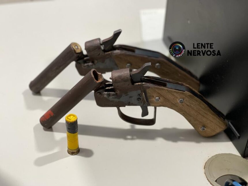 Rapidamente os policiais foram atrás dos suspeitos e ao entrarem no bloco, ouviram barulho no segundo andar, conseguindo deter o adolescente. No apartamento em que ele estava, os policiais localizaram duas armas de fogo de fabricação caseira, que estavam escondidas embaixo da cama.