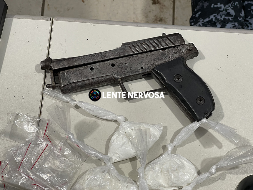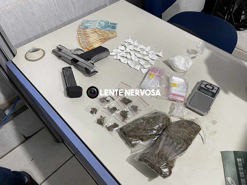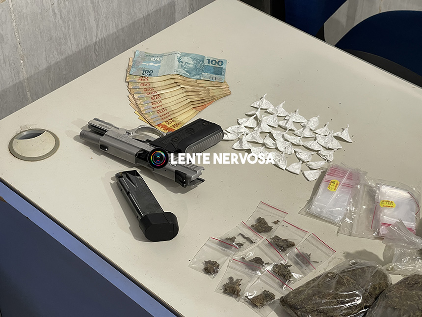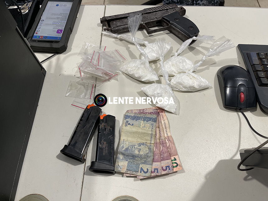 Durante buscas pelo apartamento, os policiais encontraram, escondida no sofá, uma pistola .40 com carregador e 10 munições. Em cima da geladeira os militares encontraram um pote com várias porções de entorpecente, entre maconha e cocaína. Debaixo do colchão foram encontrados R$640 em espécie.