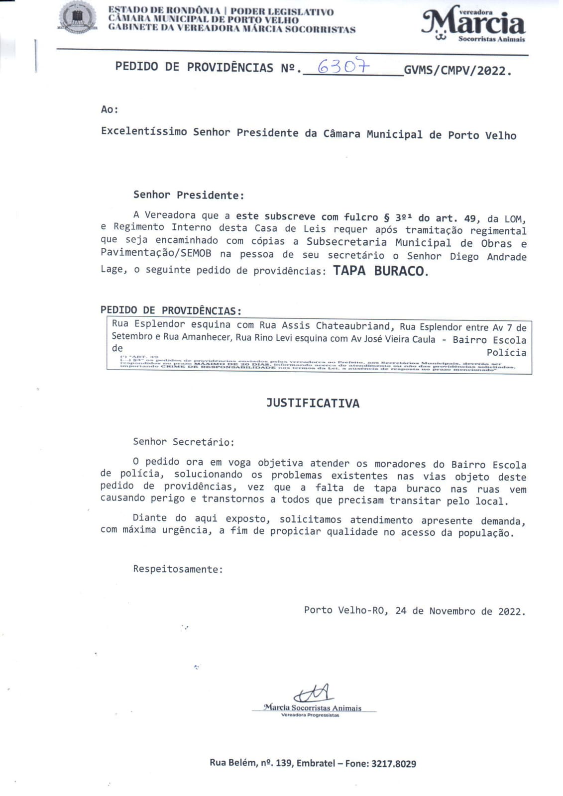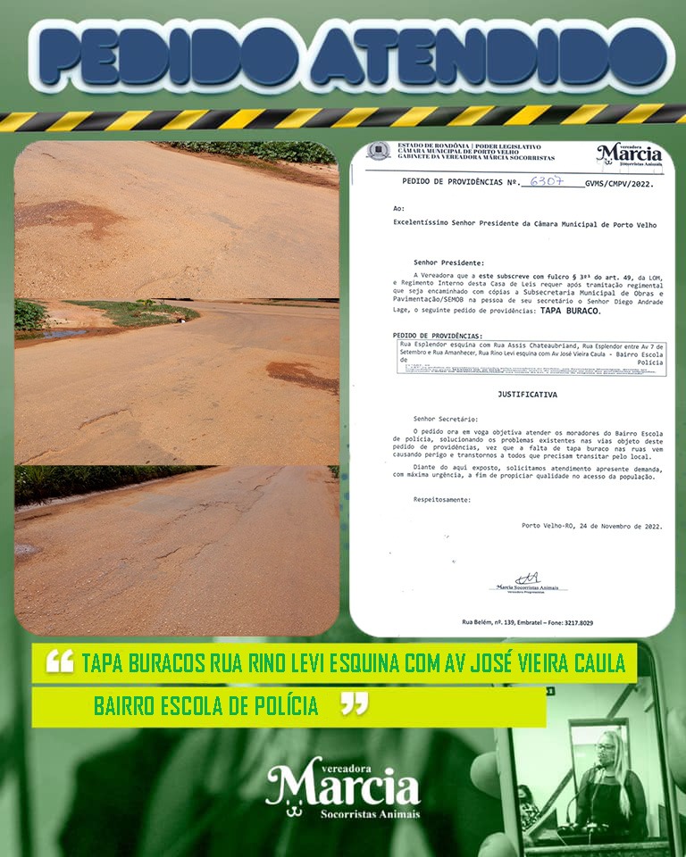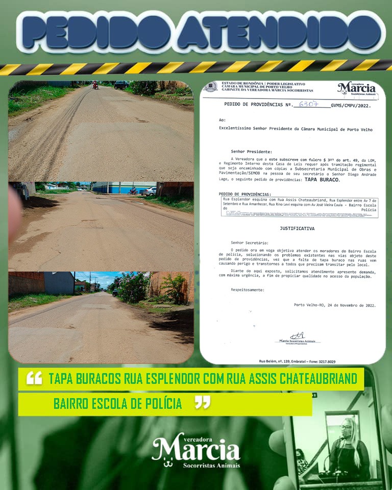 Atendendo solicitação de moradores do Bairro Escola de Polícia, na zona leste de Porto Velho, a vereadora Márcia Socorristas Animais (PP), solicitou junto à Secretaria Municipal de Obras (Semob), o serviço de tapa buracos para várias ruas do bairro.