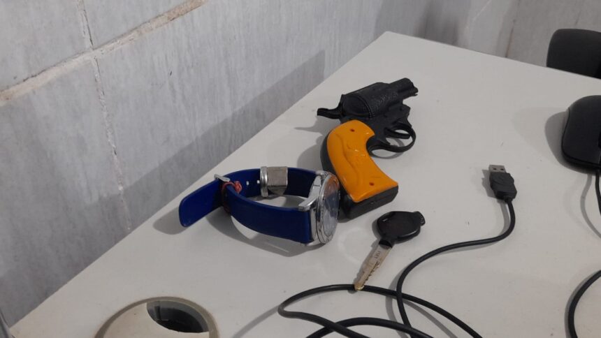 As testemunhas viram o momento em que uma arma de fogo caiu da cintura de Jorge. Rapidamente, os policiais detiveram o suspeito e encontraram com ele dois aparelhos celulares, além de um relógio. Logo foi constatado que a arma era de brinquedo.