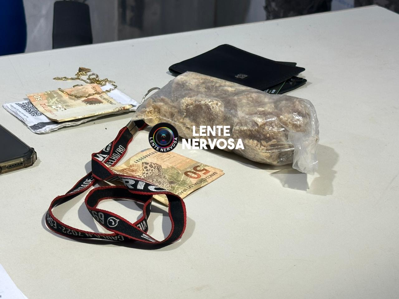 Durante revista pessoal, os policiais encontraram nas vestes de Vitor, um saco plástico contendo dentro quase 300 gramas de crack. Aos militares, o suspeito informou que vendi a droga em porções e que utilizava a motocicleta para fazer a entrega do entorpecente.