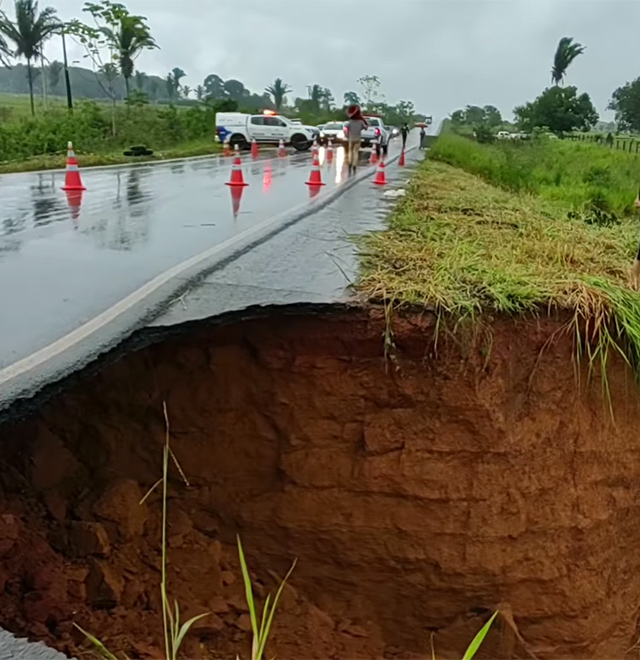 No município de Vilhena, no Km 70, da BR-435, há risco de rompimento de uma parte da pista, segundo a PRF. Até o momento, os veículos seguem passando com cautela em ambos os lados.