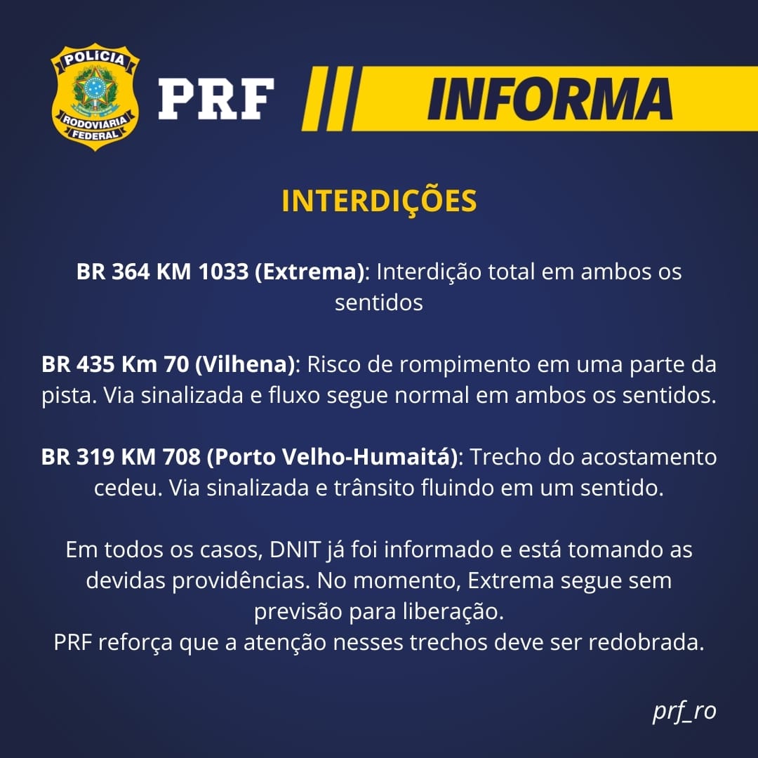 De acordo com a Polícia Rodoviária Federal, em Extrema, em Porto Velho, a BR-364, no Km 1033, segue interditada totalmente e sem previsão de liberação. Uma enorme cratera se formou na pista, desde o último domingo (19).