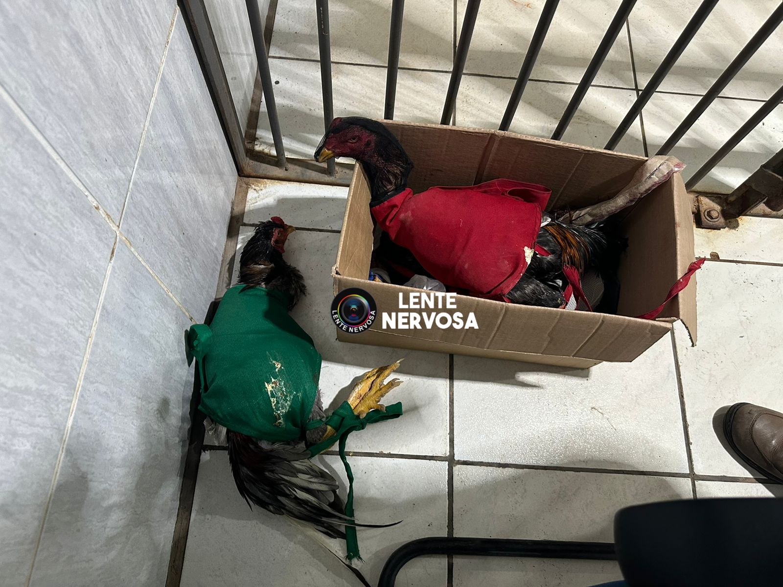 O que estava na garupa levava um galo, que estava bastante machucado e sangrando. Os policiais o questionaram sobre o motivo da ave estar ferida e o suspeito relatou que ele havia participado de uma rinha, em um imóvel no final da rua.