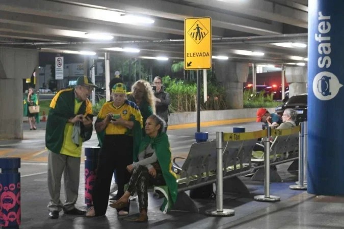 O avião pousou por volta das 6h40. No saguão, os bolsonaristas cantavam o Hino Nacional e entoavam o coro de “Deus, pátria, família e liberdade” — bandeiras defendidas durante a campanha. Eles chamaram pelo “mito” e também xingaram o presidente Luiz Inácio Lula da Silva (PT) de “ladrão” enquanto esperavam algum sinal de Bolsonaro.