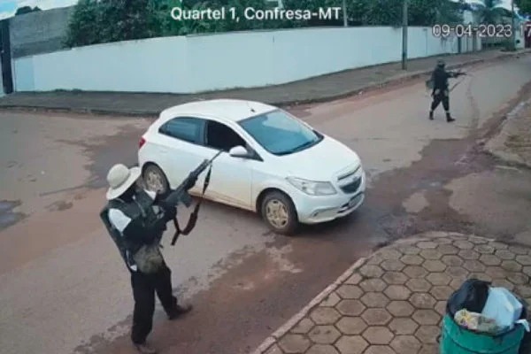 Câmeras de segurança registram o momento em que bandidos, fortemente armados (calibre .50 e .30), descem de carro para atacar Quartel da PM em Confresa (1.058 km a de Cuiabá).