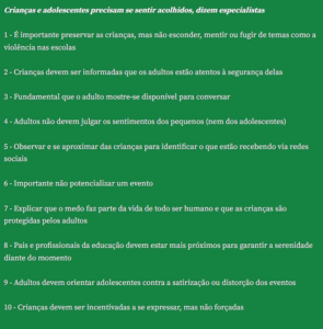Acolher esses sentimentos é a palavra adequada, segundo a professora de psicologia Belinda Mandelbaum, da Universidade de São Paulo (USP). “Em um primeiro momento, é necessário escutar o que chegou até elas. Escutar os medos e as impressões. A partir dessa escuta, os adultos podem, de alguma maneira, contribuir para uma ampliação da compreensão da criança sobre aquilo que ocorreu”. Assim, os adultos devem ficar disponíveis para poder responder às perguntas das crianças, ouvir e pensar com ela sobre as questões que elas têm.