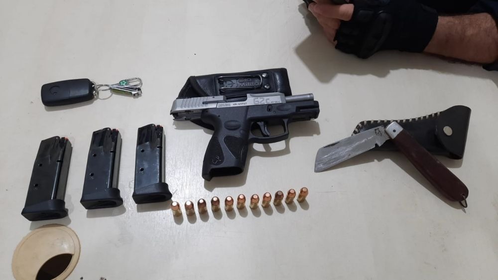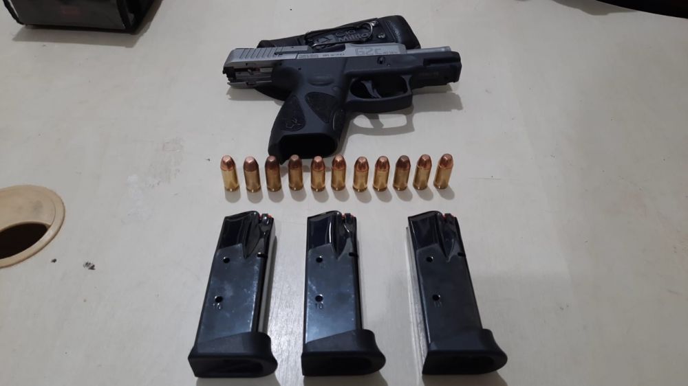 Durante uma revista minuciosa pelo interior do carro, os PM’s localizaram uma pistola .40, com onze munições intactas e dois carregadores vazios, registrada em nome da condutora.