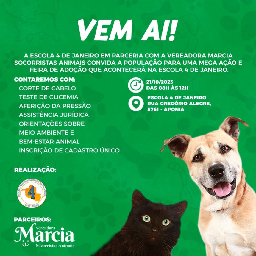 “Ficamos felizes em realizar ações como estas e, ainda mais feliz, fica quem pode adotar um cachorro ou gato. Quem adota está ajudando a salvar a vida do pet. A ação em parceria com a Escola 4 de Janeiro estreita a relação da comunidade escolar com o restante da população em uma causa tão nobre que é a adoção responsável”, finalizou a vereadora.