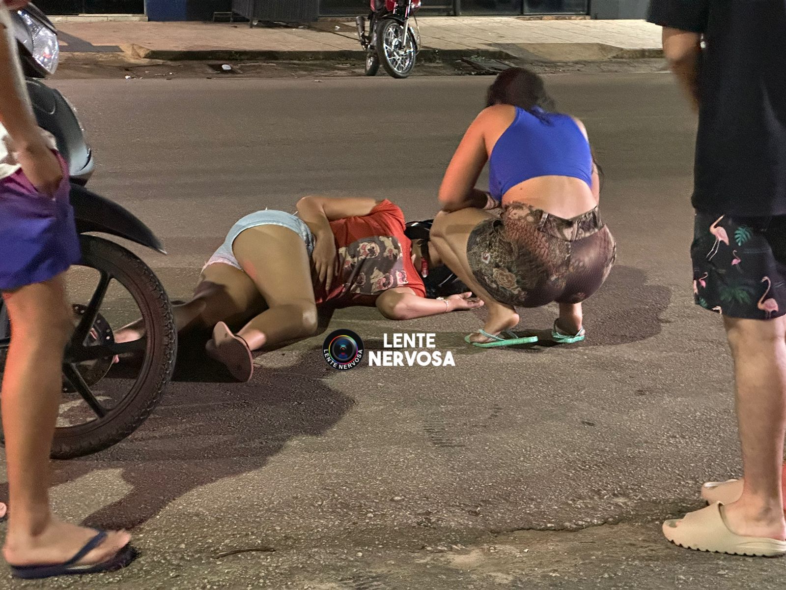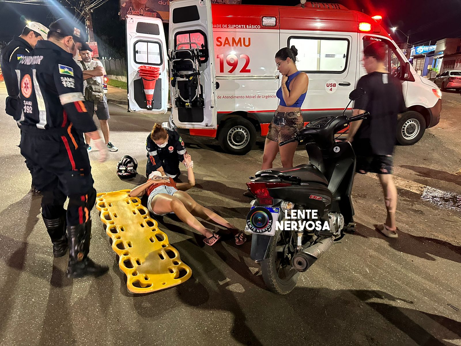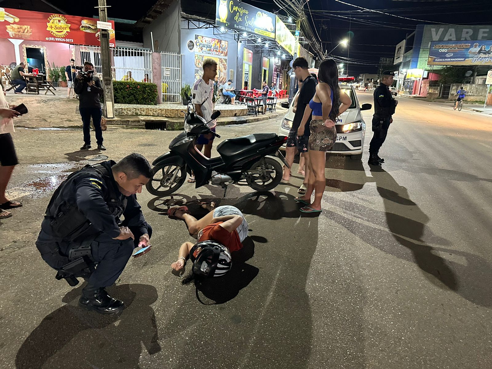 Devido à colisão, a motociclista acabou perdendo o controle do veículo e sofreu queda. Ela sentia muitas dores e evitou se mexer, enquanto os policiais ao lado solicitavam uma equipe de resgate.