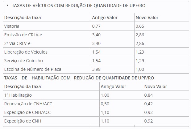 Alteração de nomenclatura de diversas taxas e serviços que passaram por inovação tecnológica, mudança procedimental, bem como atualização de cumprimentos. Redução nos valores, em UPF/RO, das seguintes taxas: