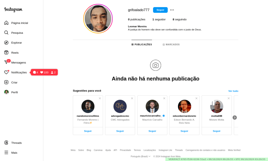 Em decisão liminar recente da juíza da 20ª Zona Eleitoral, Juliana Paula Silva da Costa, o perfil no Instagram “grifoalado777” (com apenas 2 seguidores e nenhuma publicação), que teoricamente pertence a Leomar Moreira, deve ter os dados divulgados pelo Facebook (responsável pelo Instagram).