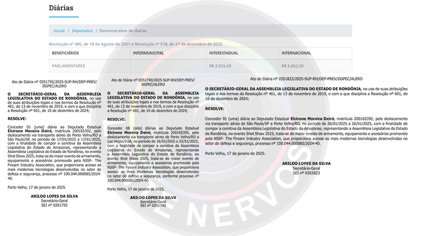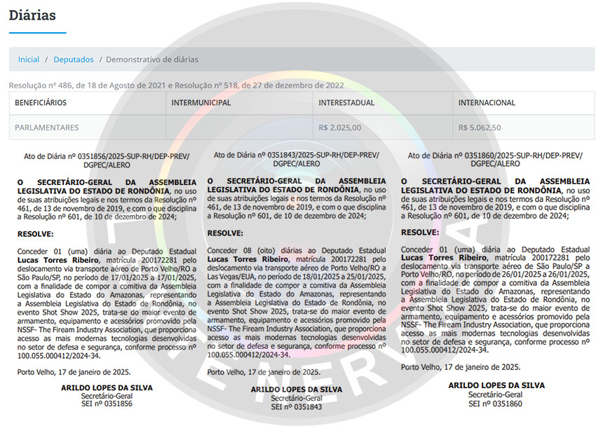 De acordo com documentos oficiais, os parlamentares foram designados para compor uma comitiva em parceria com a Assembleia Legislativa do Estado do Amazonas. Para o deslocamento internacional entre Porto Velho e Las Vegas, cada deputado recebeu 10 diárias, totalizando R$ 44.550,00 por parlamentar. O valor unitário da diária internacional é de R$ 5.062,50, enquanto a diária interestadual é de R$2.025,00, conforme os registros do Portal da Transparência da ALE/RO.