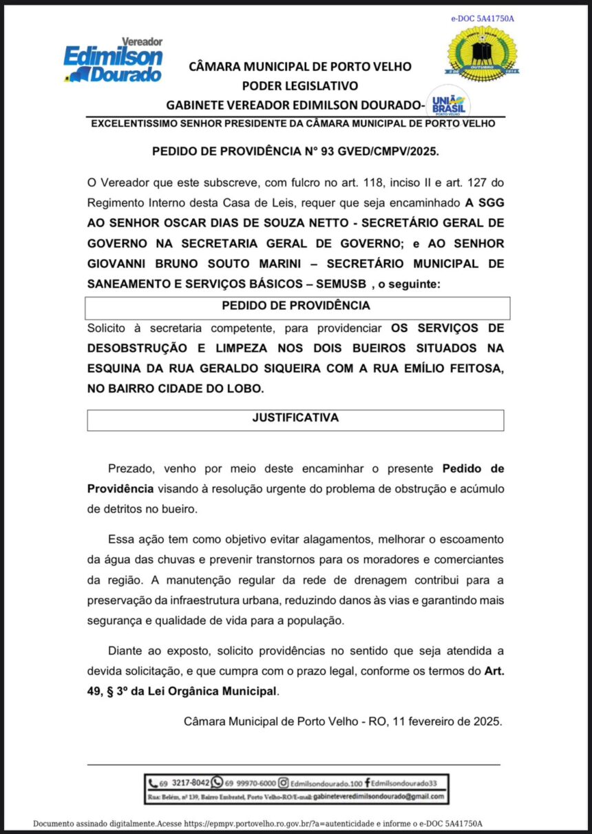 O vereador Edimilson Dourado (União Brasil) solicitou junto à Secretaria Municipal de Saneamento e Serviços Básicos, através de seu secretário Giovanni Marinho, a desobstrução e colocação de tampas de concreto em dois bueiros na esquina da Rua Geraldo Siqueira com Rua Emílio Feitosa, no Bairro Cidade do Lobo, zona sul de Porto Velho.