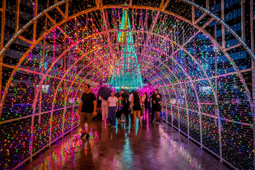 A decoração do “Jardim Encantado” tem túnel de luz logo no Portal de Entrada; borboletas gigantes; bosque de cerejeiras cor-de-rosa; uma árvore digital no meio do jardim com projeção de imagens animadas e trilhas sonoras; céu nevado; além do letreiro iluminado do Natal de Luz e das fachadas dos prédios que viraram grandes caixas de presentes luminosas.