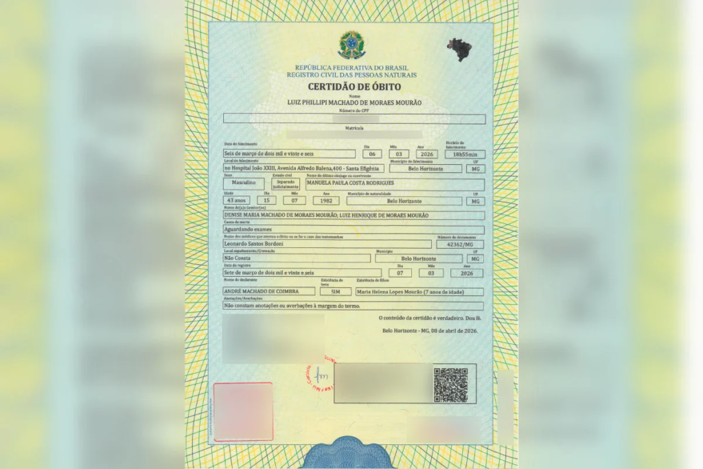 Apesar de a Polícia Federal (PF) informar que a morte foi decorrente de uma tentativa de suicídio na prisão, a certidão de óbito de Luiz Phillipi Machado de Moraes Mourão, o “Sicário” do banqueiro Daniel Vorcaro, não traz o motivo do falecimento.