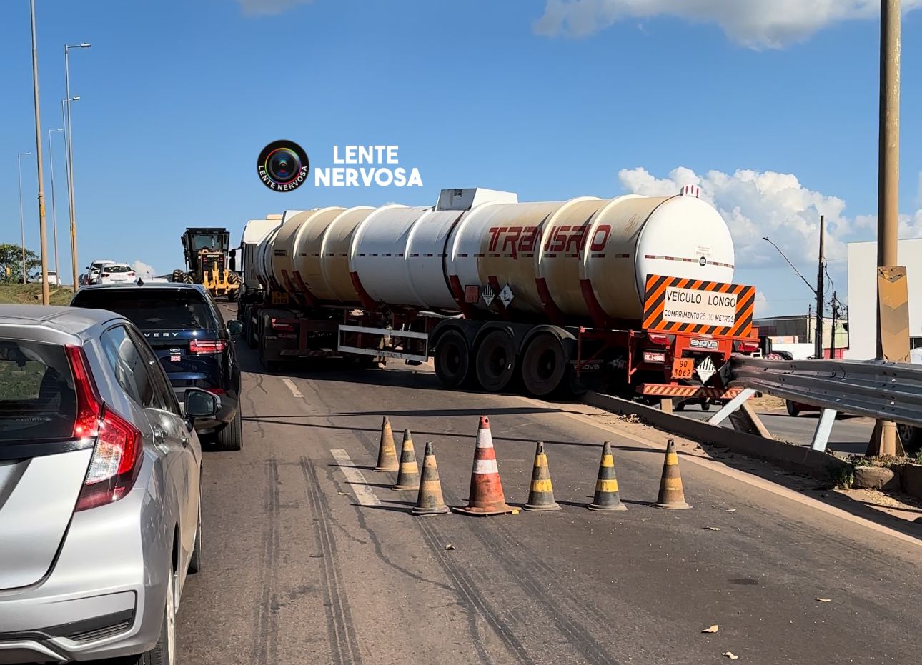 A carreta atingiu o Guard Rail, estrutura de ferro montada justamente para evitar que veículos em situação de emergência caiam para fora do viaduto.