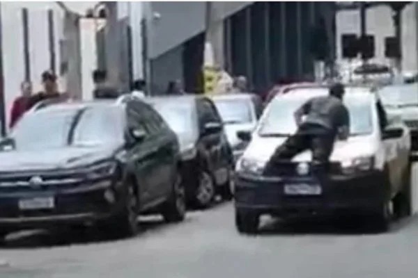 Vídeo que circula pelas redes sociais mostra o momento em que o homem se joga em cima do veículo em movimento
