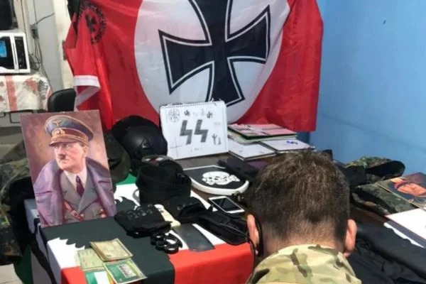 Agentes encontraram bandeiras e fotos de Hitler no quarto do adolescente. Um dos símbolos do nazismo teria sido presente do pai